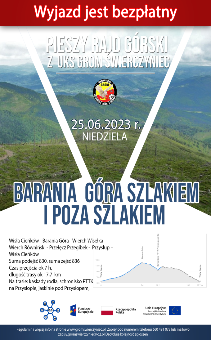 Kolejny wyjazd 25.06.2023 (niedziela) zaprowadzi nas do Wisły Cieńków, będziemy zdobywać Baranią Górę. Trasa biegnie z Wisły Cienków na Baranią Górę (1201 m n.p.m), po zdobyciu szczytu idziemy przez Wierch Wisełka, Wierch Równiński i Przełęcz Przegibek do schroniska pod Przysłopem, tam posiłek i zejście do Wisły. Trasa liczy ok 17,7 km czas przejścia to ok 7h nie wliczając przerw. Tym razem podejść mamy ok 830m a zejść 938m