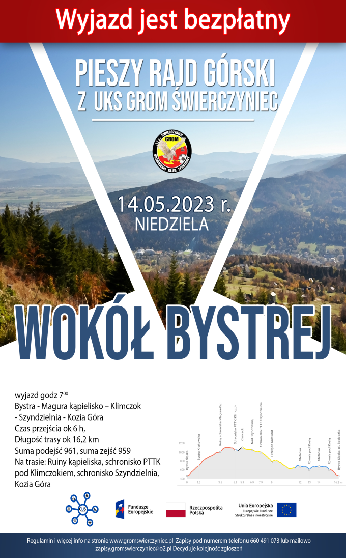 Proponowane trasy opracowane przez przewodnika z Bielskiego PTTK. Pierwszy wyjazd planowany jest 14.05.2023r (niedziela), udamy się do Bystrej gdzie przejdziemy przez Magurę Kąpielisko na Klimczok, chwila przerwy przy schronisku, następnie udamy się na Szyndzielnię tam kolejna przerwa na posiłek, po odpoczynku udamy się do Bystrej pod autokar zaliczając po drodze Kozią Górę. Trasa liczy ok 16km a czas przejścia to ok 6h bez przerw. Najwyższym szczytem tego rajdu jest Klimczok (1117m m n.p.m), suma podejść wyniesie 961m a zejść jest prawie tyle samo bo 959 m.