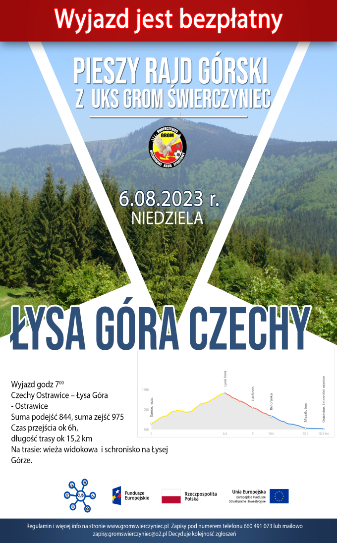 Ostatni czwarty wyjazd odbędzie się 06.08.2023 (niedziela) zdobędziemy Łysą Górę w Czechach. Udamy się do Ostrawic gdzie wyruszymy zdobyć Łysą Górę ( 1314 m n.p.m.). Na szczycie wieża widokowa i schronisko gdzie odpoczniemy Długość tej trasy to ok 15 km , suma podejść 844m a zejść 975m , czas przejścia to ok 6h