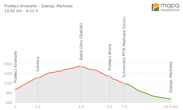 Startujemy z Przełęczy Krowiarki , idziemy przez Sokolicę, na szczyt Babiej Góry, trasa dość wymagająca szczególnie podejście na Sokolicę. Według naszego przewodnika szczyt zdobędziemy po ok 4h, później zejście do schroniska (ok 40 min) a następnie posiłek i odpoczynek ok 2h. Po posiłku i odpoczynku zmęczeni lecz zadowoleni ruszymy w stronę autokaru , możliwe są dwa miejsca, (decydować będzie kondycja i pogoda) albo zejście zielonym szlakiem do Zawoi Markowej ( ok 1h), albo powrót szlakiem niebieskim na Przełęcz Krowiarki (ok 2h).